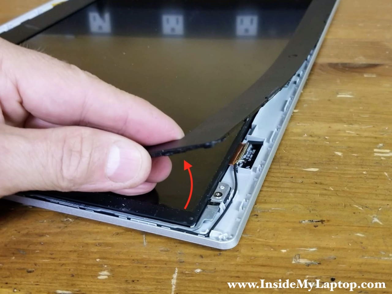 Continue removing the bezel on the top side of the display. After that move to the sides and the bottom.