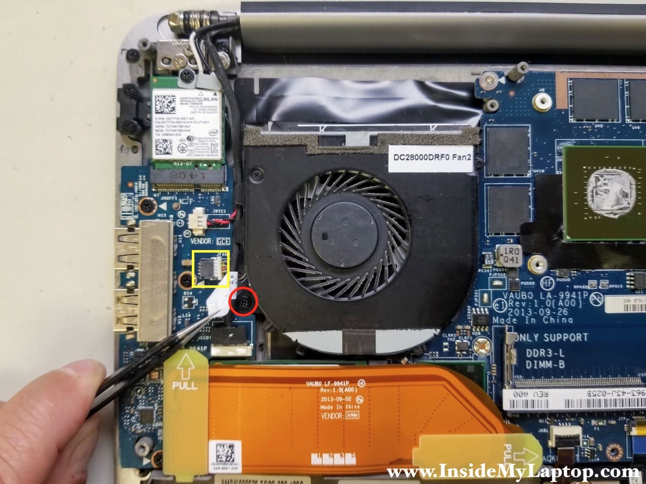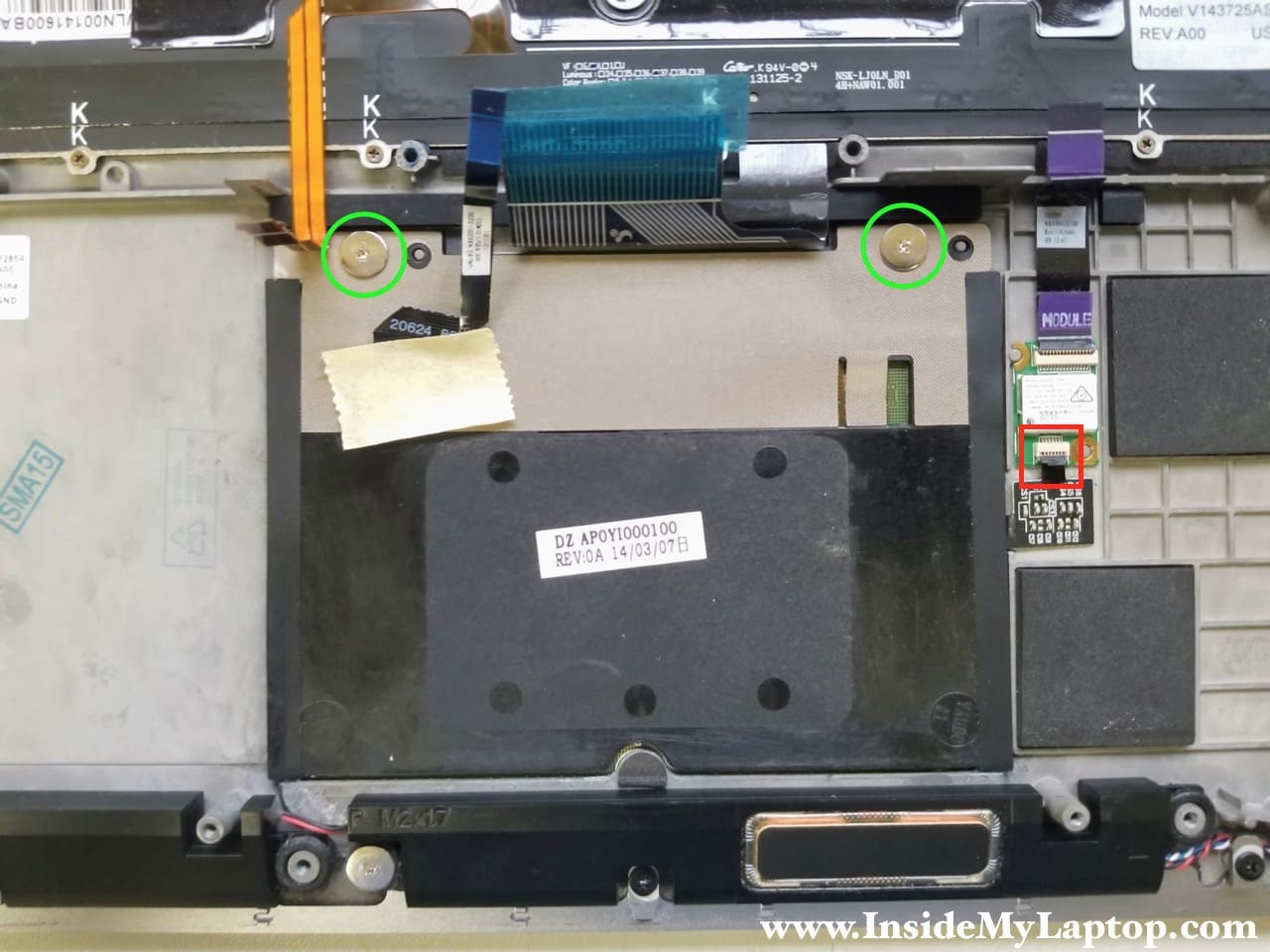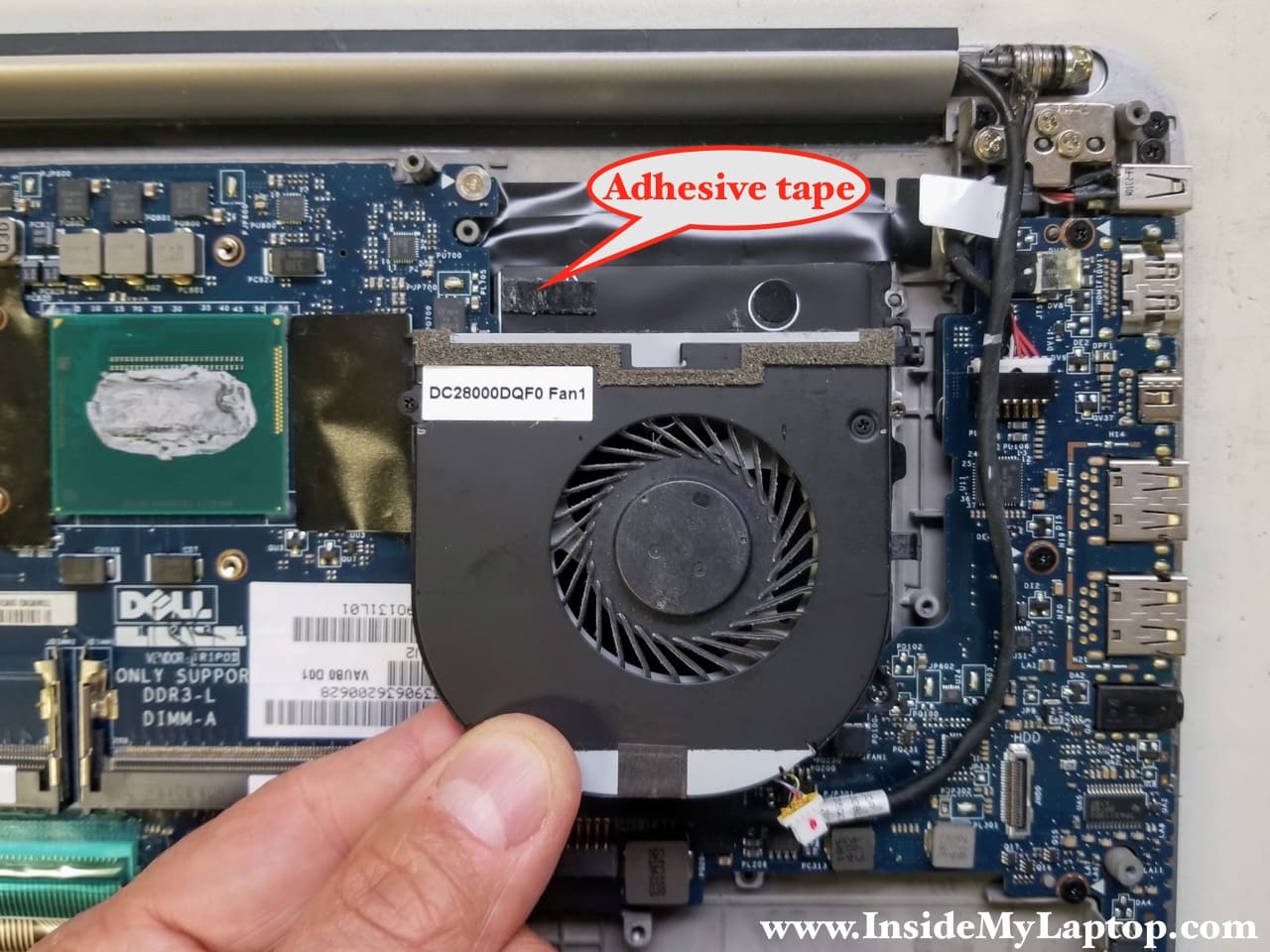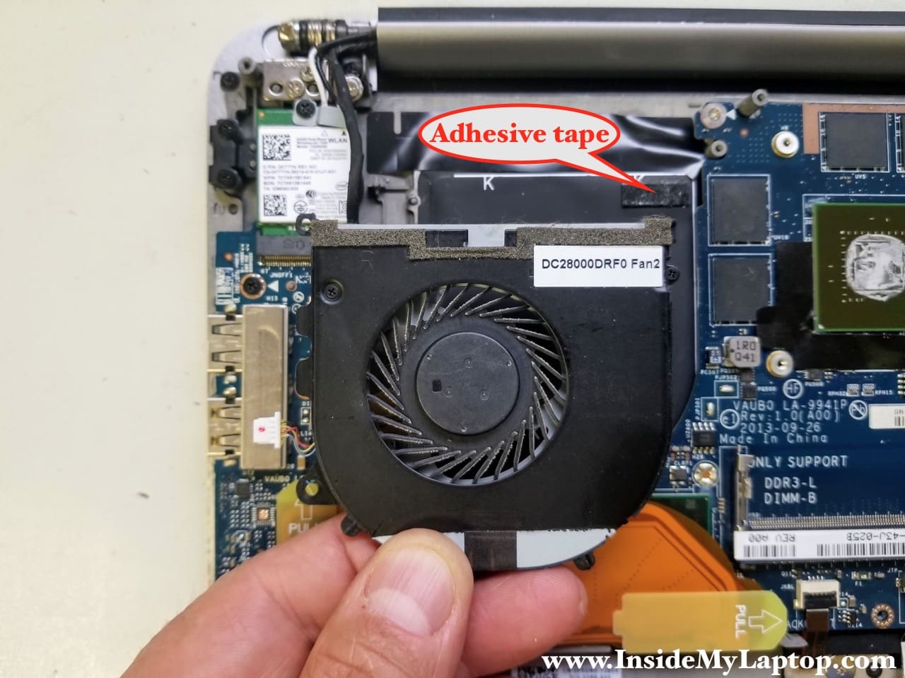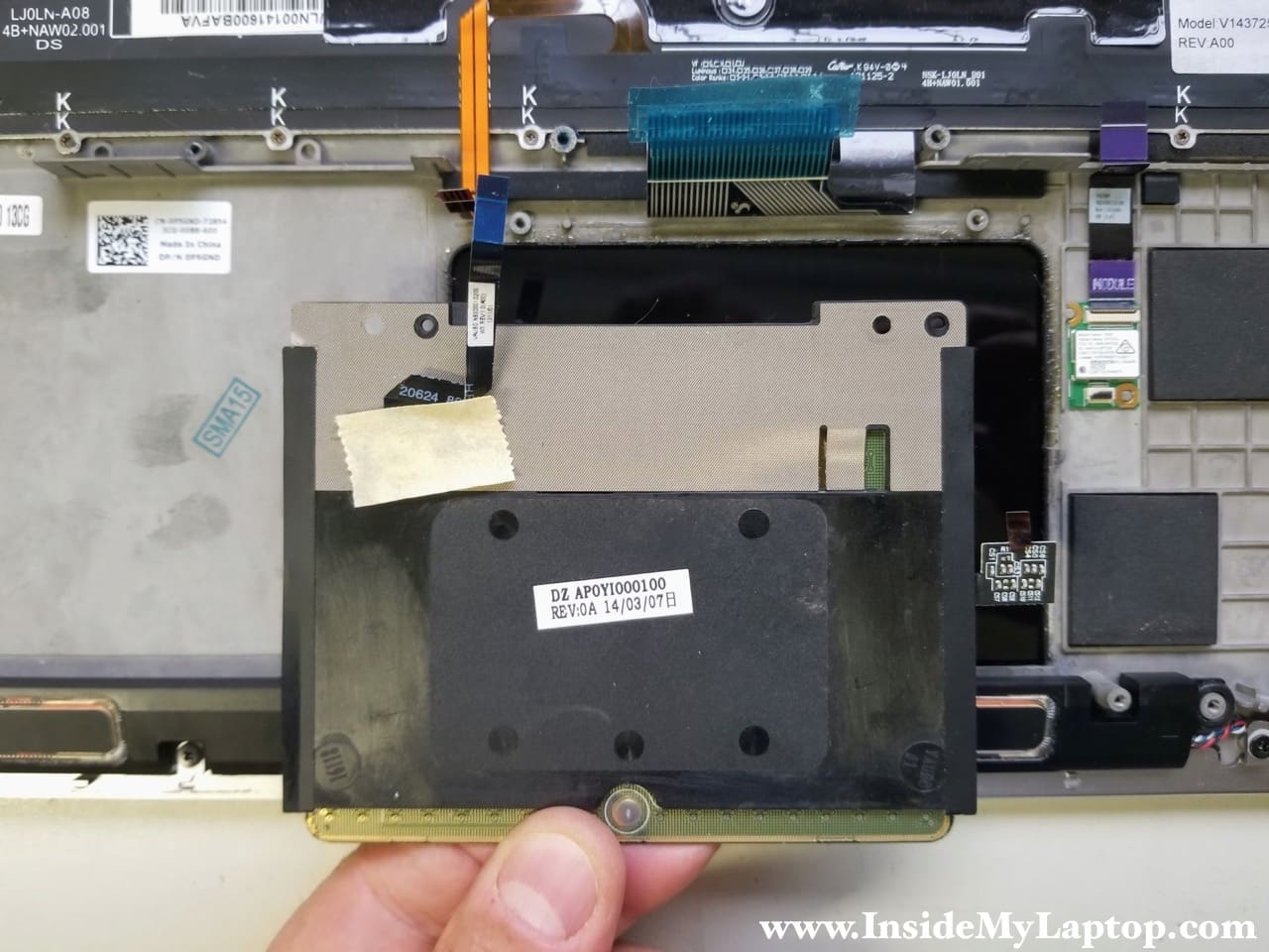 While removing the fan, you will have to un-route the touch screen cable from the left side of the housing. It’s necessary to apply some reasonable force to separate the fan from the top case because the fan is secured by adhesive tape underneath.