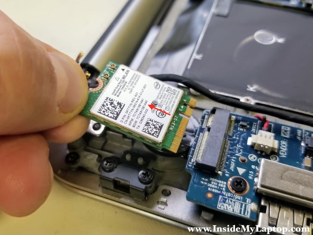 Remove one screw from the WLAN card bracket. Disconnect both antenna cables from the WLAN card.