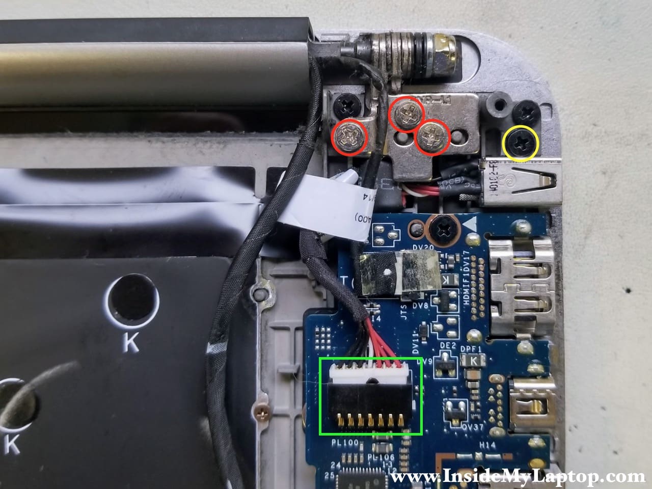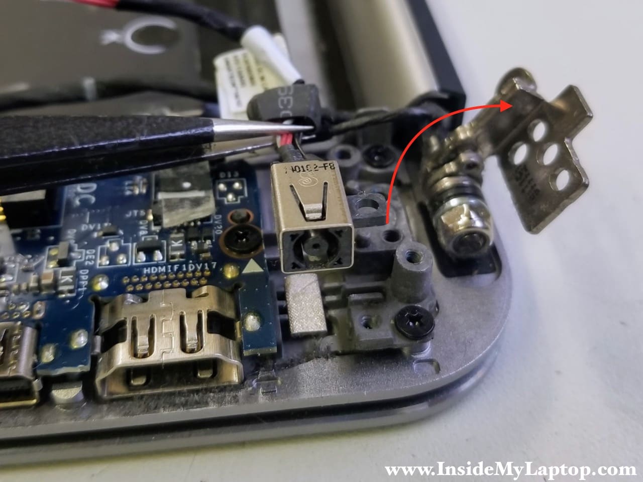 Remove three screws securing the hinge and one screw securing the DC-IN power jack.
