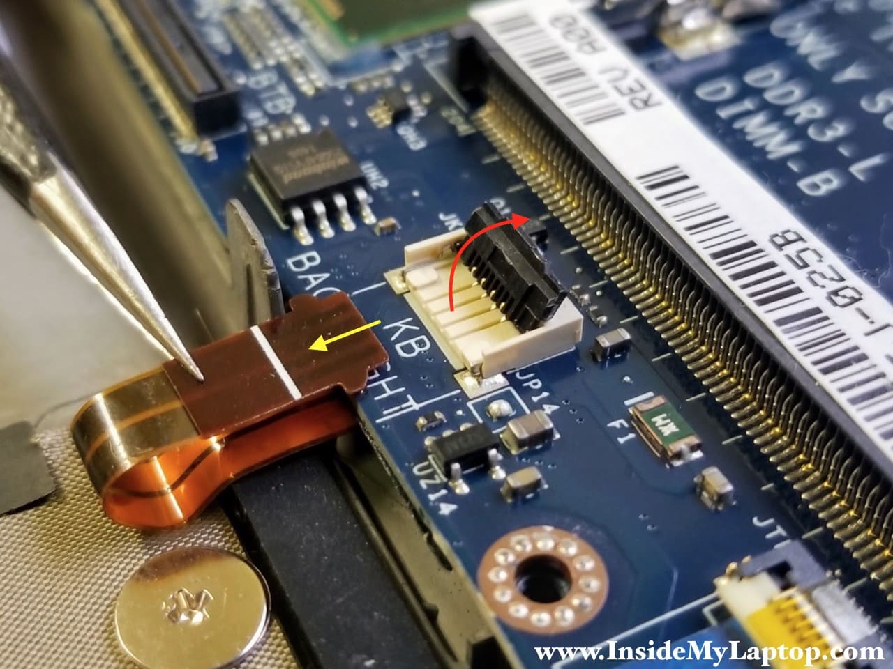 The keyboard cable can be released the same way. Unlock the connector and pull the cable out.