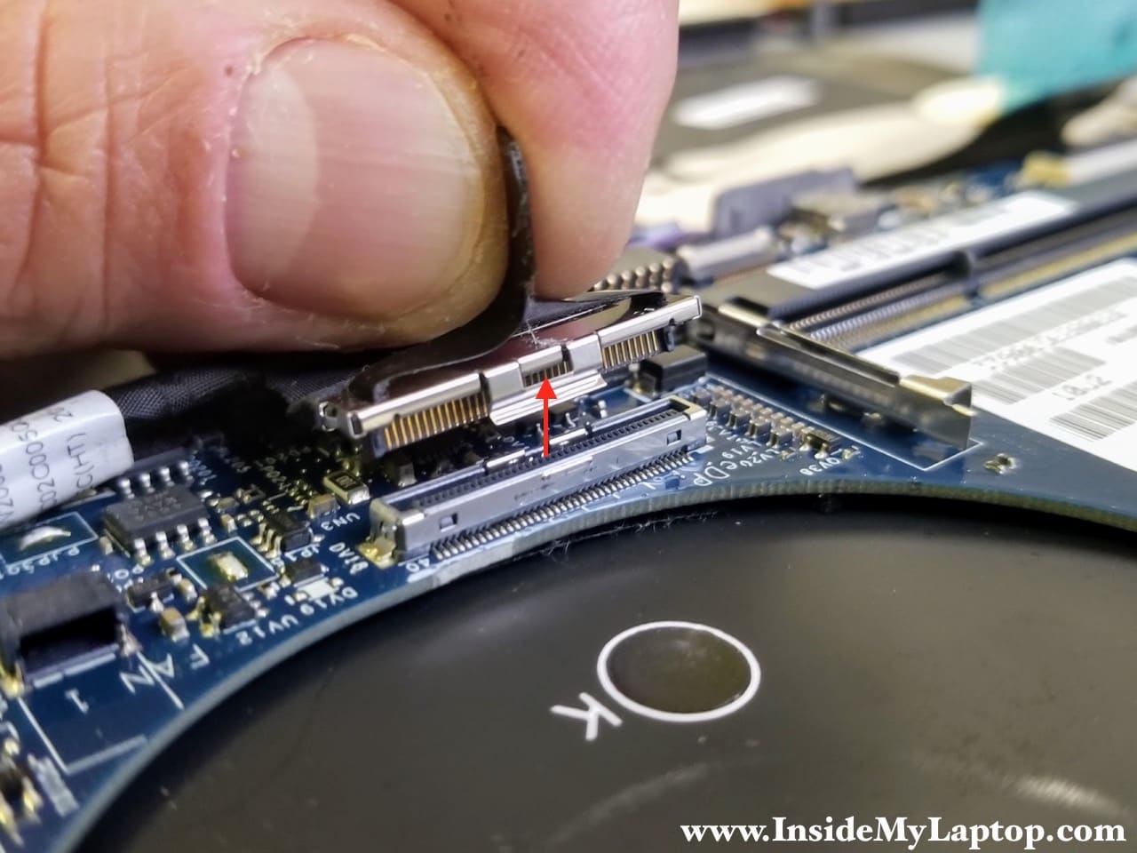 In order to disconnect the display video cable you will have to pull the connector up using the black belt on the top.