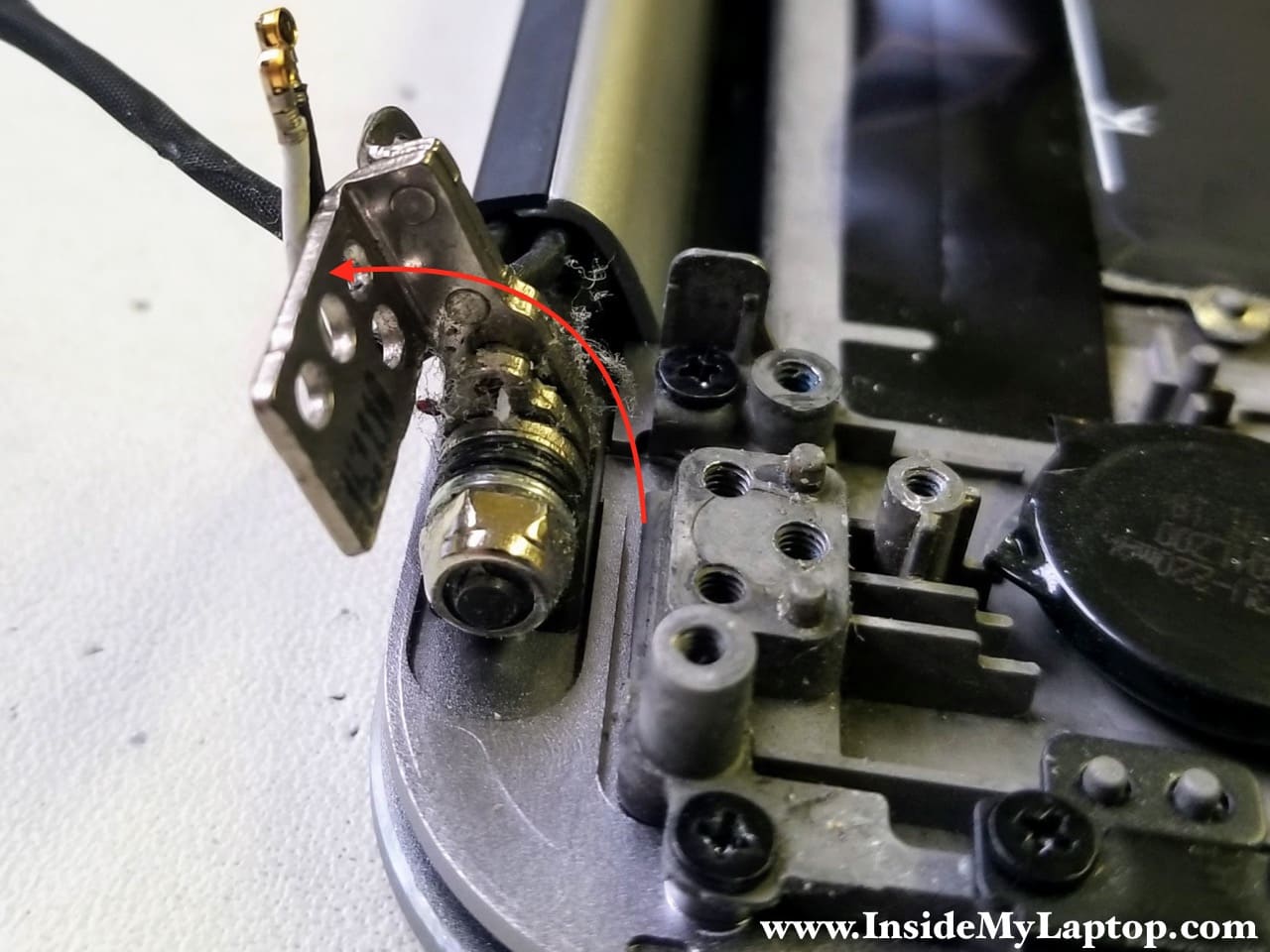 Open up the right hinge. As you remember, the left hinge was opened up in the step 20, when we removed the DC power jack.