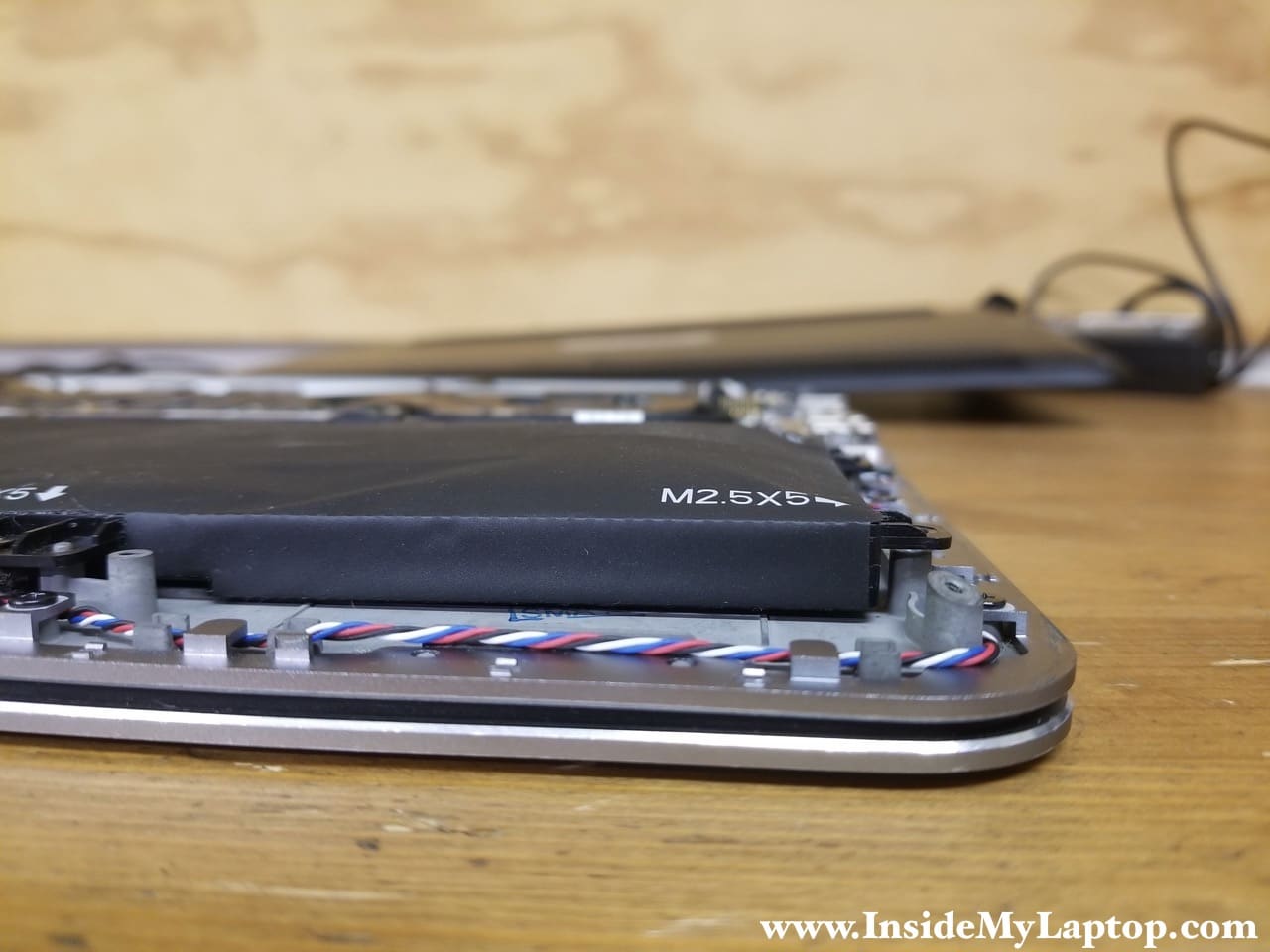 Lift up the battery, unplug the battery cable from the motherboard and remove it from the laptop.